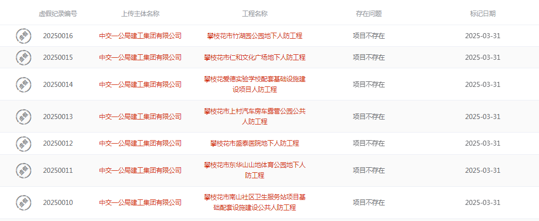 据全国四库一平台网站公示,虚假业绩出现中交一公局建工集团有限公司,其业绩造假条数多达22条,打开业绩项目信息发现,其施工、设计单位均为同一家单位,项目信息披露为不存在。上传主体单位为其企业。