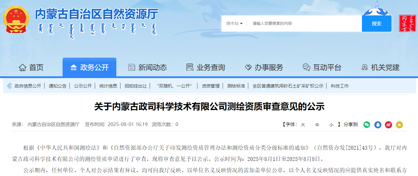 根据《中华人民共和国测绘法》和《自然资源部办公厅关于印发测绘资质管理办法和测绘资质分类分级标准的通知》(自然资办发[2021]43号),我厅对内蒙古政司科学技术有限公司的测绘资质申请进行了审查,现将审查意见予以公示。公示时间为:2025年8月1日至2025年8月8日。
